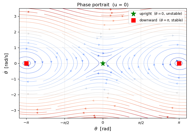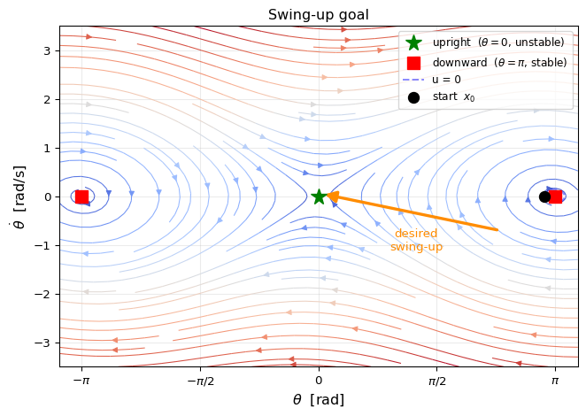 The phase portrait makes clear why swing-up requires a nontrivial trajectory: the goal lies on the other side of the separatrix from the natural free motion.